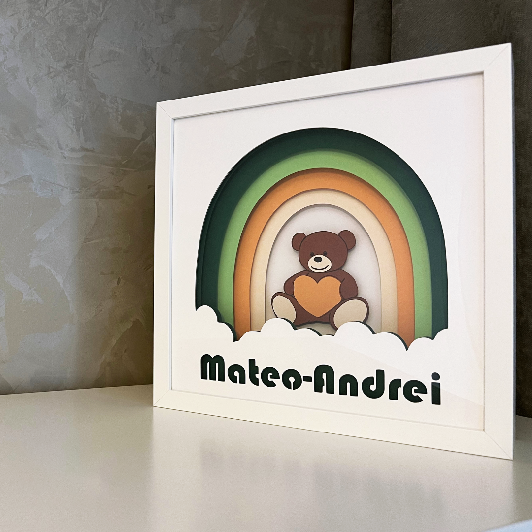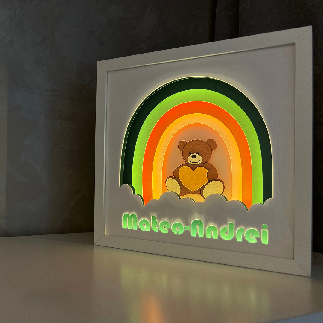 Tablourile luminoase lucrate manual, cu teme si mesaje personalizate, includ mai multe straturi de hartie, asamblate intr-o rama confectionata din MDF, cu protectie frontala din plastic polistirenic, fiind sigura pentru cei mici. Hartia utilizata pentru realizarea tablourilor este o hartie de calitate superioara, fara acid, care nu se ingalbeneste si are o rezistenta mare timp indelungat.