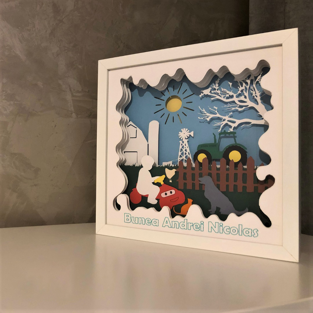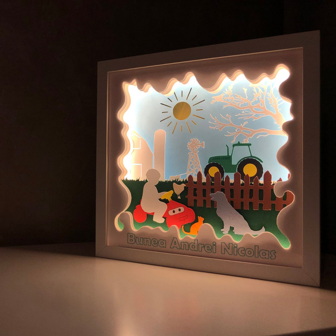 Tablourile luminoase lucrate manual, cu teme si mesaje personalizate, includ mai multe straturi de hartie, asamblate intr-o rama confectionata din MDF, cu protectie frontala din plastic polistirenic, fiind sigura pentru cei mici. Hartia utilizata pentru realizarea tablourilor este o hartie de calitate superioara, fara acid, care nu se ingalbeneste si are o rezistenta mare timp indelungat.