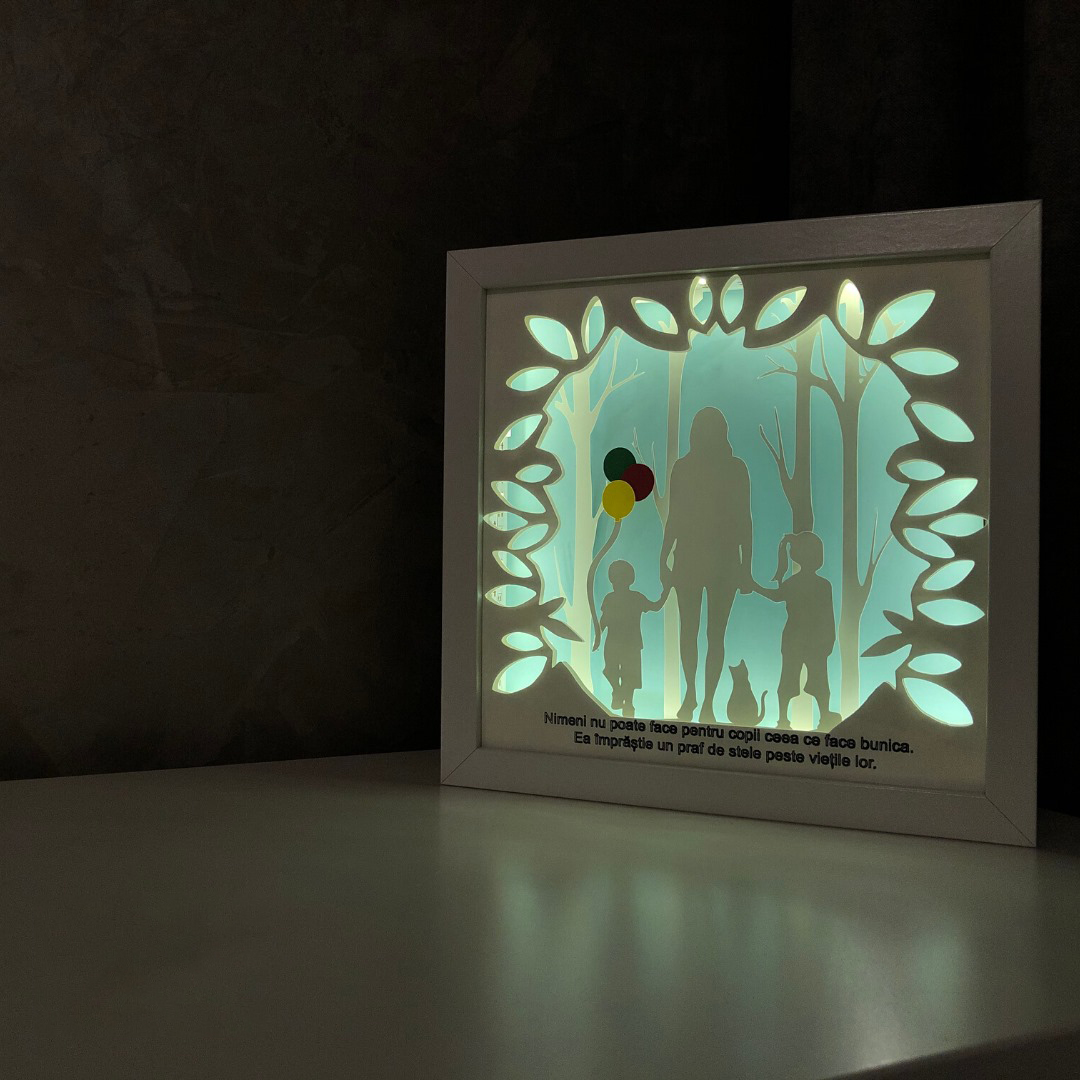 Folosite ca lampa de veghe pentru cei mici sau ca decor luminos 3D pentru cei mari, tablourile create in atelierul Noor emana o lumina calda si placuta, perfecta pentru povestile de la culcare sau ca sursa de lumina pe timpul noptii.