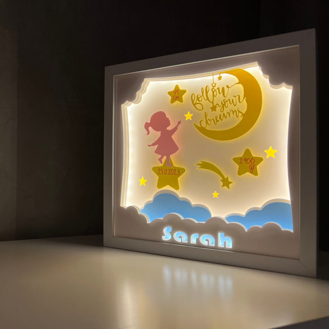 Folosite ca lampa de veghe pentru cei mici sau ca decor luminos 3D pentru cei mari, tablourile create in atelierul Noor emana o lumina calda si placuta, perfecta pentru povestile de la culcare sau ca sursa de lumina pe timpul noptii.