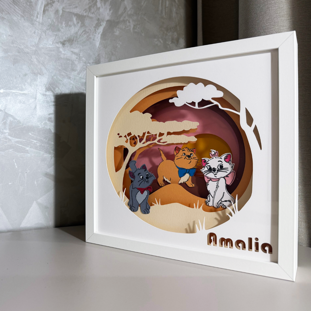Tablourile luminoase lucrate manual, cu teme si mesaje personalizate, includ mai multe straturi de hartie, asamblate intr-o rama confectionata din MDF, cu protectie frontala din plastic polistirenic, fiind sigura pentru cei mici. Hartia utilizata pentru realizarea tablourilor este o hartie de calitate superioara, fara acid, care nu se ingalbeneste si are o rezistenta mare timp indelungat.