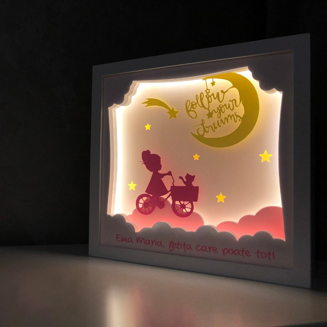 Folosite ca lampa de veghe pentru cei mici sau ca decor luminos 3D pentru cei mari, tablourile create in atelierul Noor emana o lumina calda si placuta, perfecta pentru povestile de la culcare sau ca sursa de lumina pe timpul noptii.