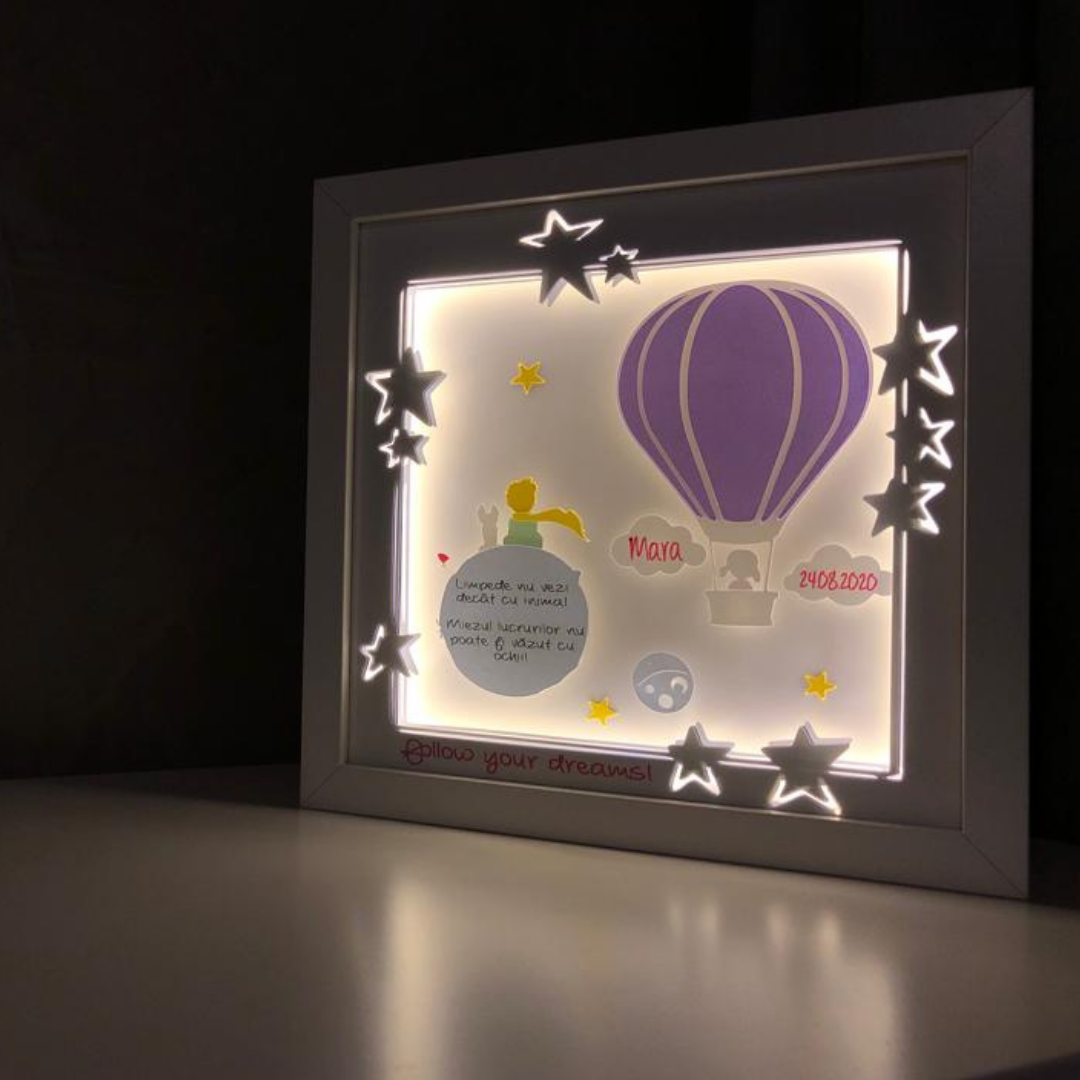 Tablourile luminoase lucrate manual, cu teme si mesaje personalizate, includ mai multe straturi de hartie, asamblate intr-o rama confectionata din MDF, cu protectie frontala din plastic polistirenic, fiind sigura pentru cei mici. Hartia utilizata pentru realizarea tablourilor este o hartie de calitate superioara, fara acid, care nu se ingalbeneste si are o rezistenta mare timp indelungat.