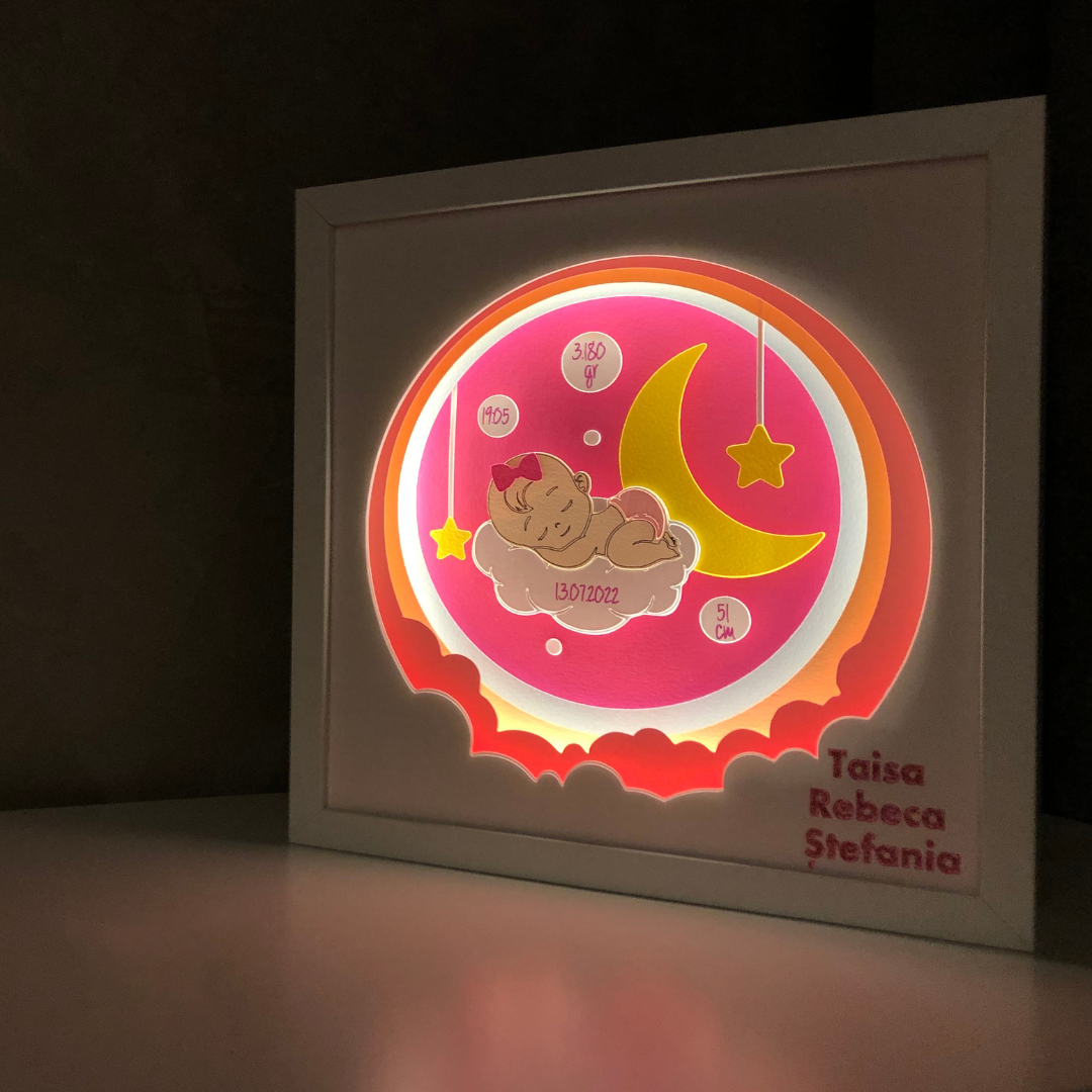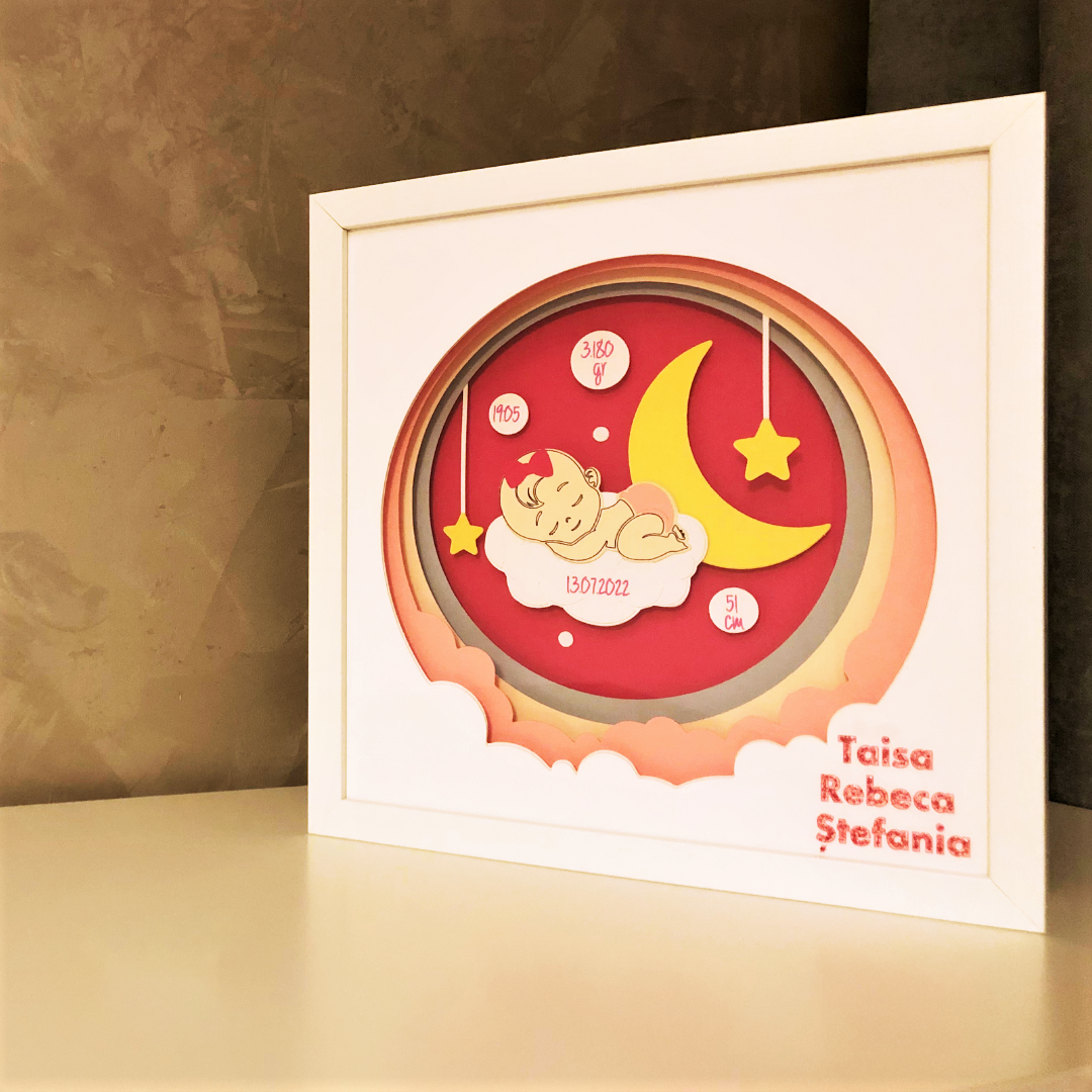 Tablourile luminoase lucrate manual, cu teme si mesaje personalizate, includ mai multe straturi de hartie, asamblate intr-o rama confectionata din MDF, cu protectie frontala din plastic polistirenic, fiind sigura pentru cei mici. Hartia utilizata pentru realizarea tablourilor este o hartie de calitate superioara, fara acid, care nu se ingalbeneste si are o rezistenta mare timp indelungat.