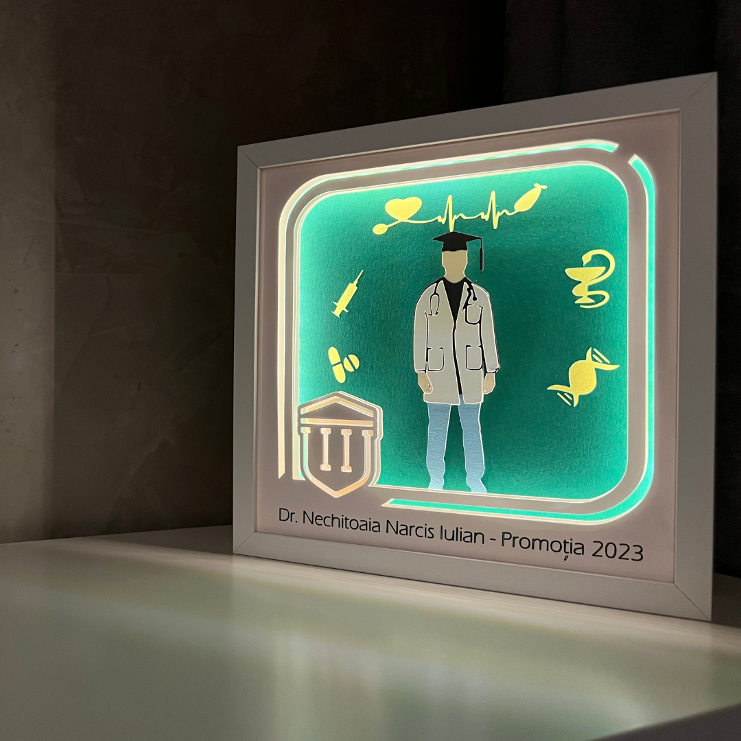 Tablourile luminoase lucrate manual, cu teme si mesaje personalizate, includ mai multe straturi de hartie, asamblate intr-o rama confectionata din MDF, cu protectie frontala din plastic polistirenic, fiind sigura pentru cei mici. Hartia utilizata pentru realizarea tablourilor este o hartie de calitate superioara, fara acid, care nu se ingalbeneste si are o rezistenta mare timp indelungat.