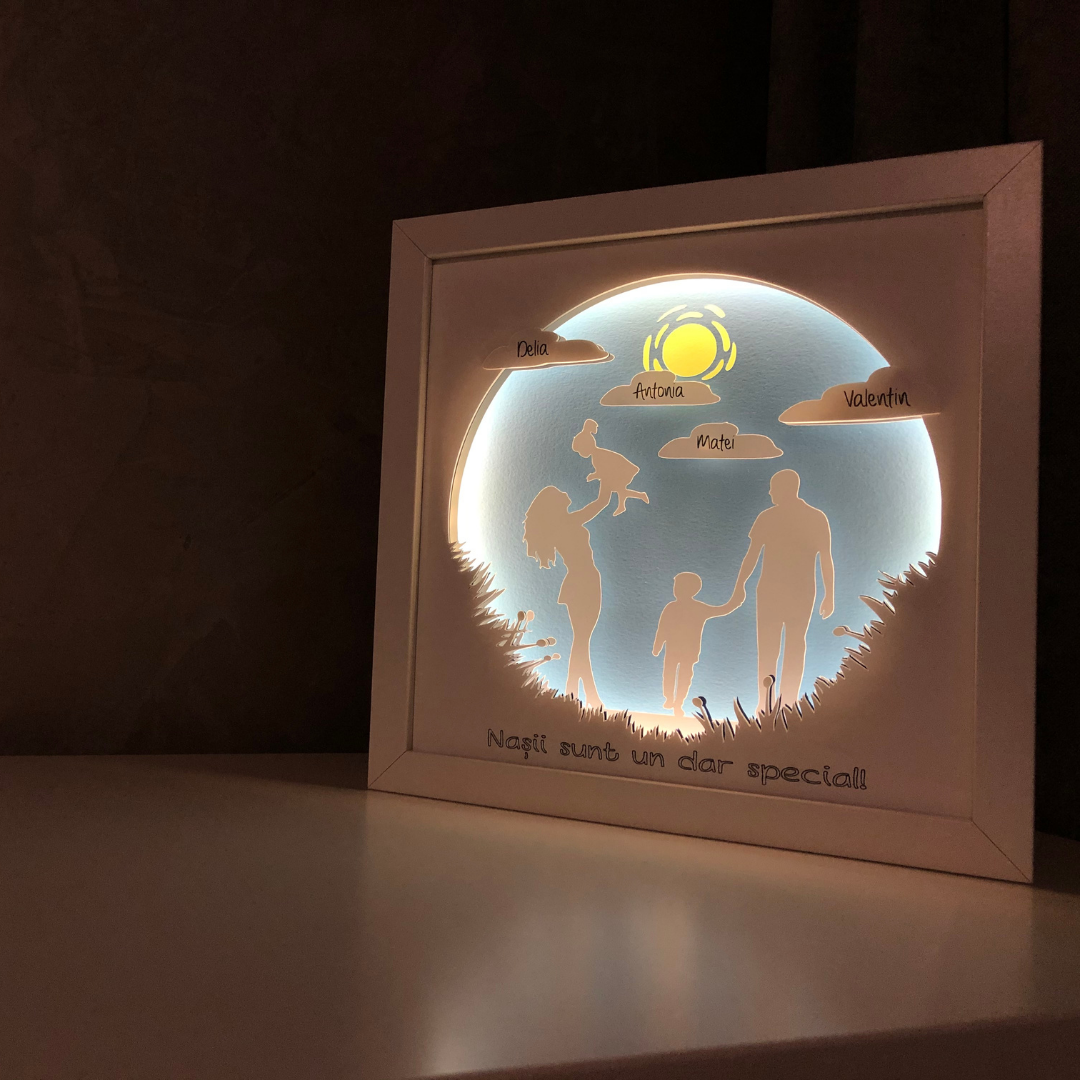 Folosite ca lampa de veghe pentru cei mici sau ca decor luminos 3D pentru cei mari, tablourile create in atelierul Noor emana o lumina calda si placuta, perfecta pentru povestile de la culcare sau ca sursa de lumina pe timpul noptii.