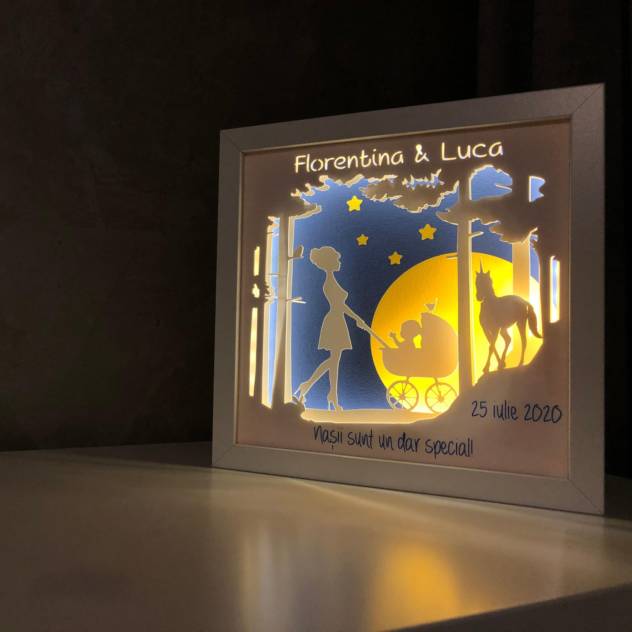 Folosite ca lampa de veghe pentru cei mici sau ca decor luminos 3D pentru cei mari, tablourile create in atelierul Noor emana o lumina calda si placuta, perfecta pentru povestile de la culcare sau ca sursa de lumina pe timpul noptii.
