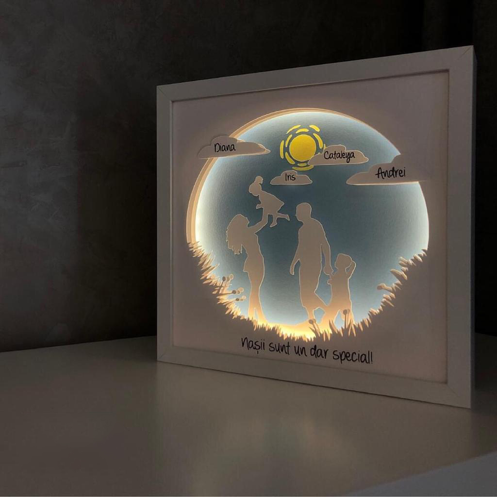 Tablourile luminoase lucrate manual, cu teme si mesaje personalizate, includ mai multe straturi de hartie, asamblate intr-o rama confectionata din MDF, cu protectie frontala din plastic polistirenic, fiind sigura pentru cei mici. Hartia utilizata pentru realizarea tablourilor este o hartie de calitate superioara, fara acid, care nu se ingalbeneste si are o rezistenta mare timp indelungat.