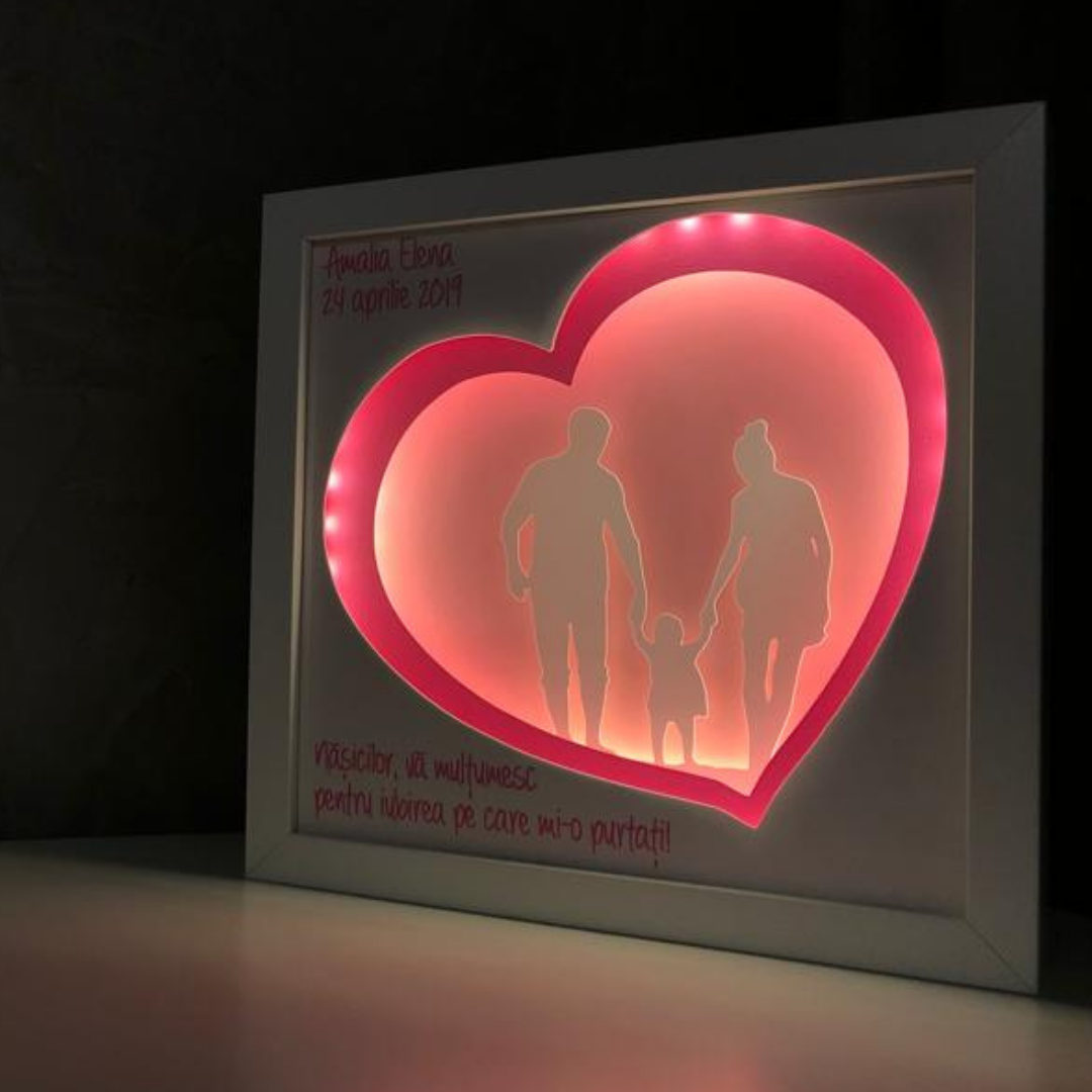 Tablourile luminoase lucrate manual, cu teme si mesaje personalizate, includ mai multe straturi de hartie, asamblate intr-o rama confectionata din MDF, cu protectie frontala din plastic polistirenic, fiind sigura pentru cei mici. Hartia utilizata pentru realizarea tablourilor este o hartie de calitate superioara, fara acid, care nu se ingalbeneste si are o rezistenta mare timp indelungat.