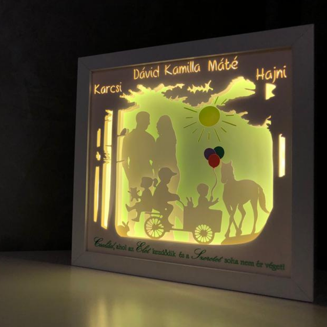 Tablourile luminoase lucrate manual, cu teme si mesaje personalizate, includ mai multe straturi de hartie, asamblate intr-o rama confectionata din MDF, cu protectie frontala din plastic polistirenic, fiind sigura pentru cei mici. Hartia utilizata pentru realizarea tablourilor este o hartie de calitate superioara, fara acid, care nu se ingalbeneste si are o rezistenta mare timp indelungat.