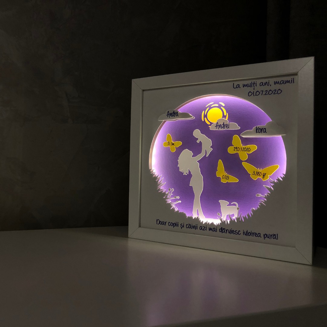Tablourile luminoase lucrate manual, cu teme si mesaje personalizate, includ mai multe straturi de hartie, asamblate intr-o rama confectionata din MDF, cu protectie frontala din plastic polistirenic, fiind sigura pentru cei mici. Hartia utilizata pentru realizarea tablourilor este o hartie de calitate superioara, fara acid, care nu se ingalbeneste si are o rezistenta mare timp indelungat.
