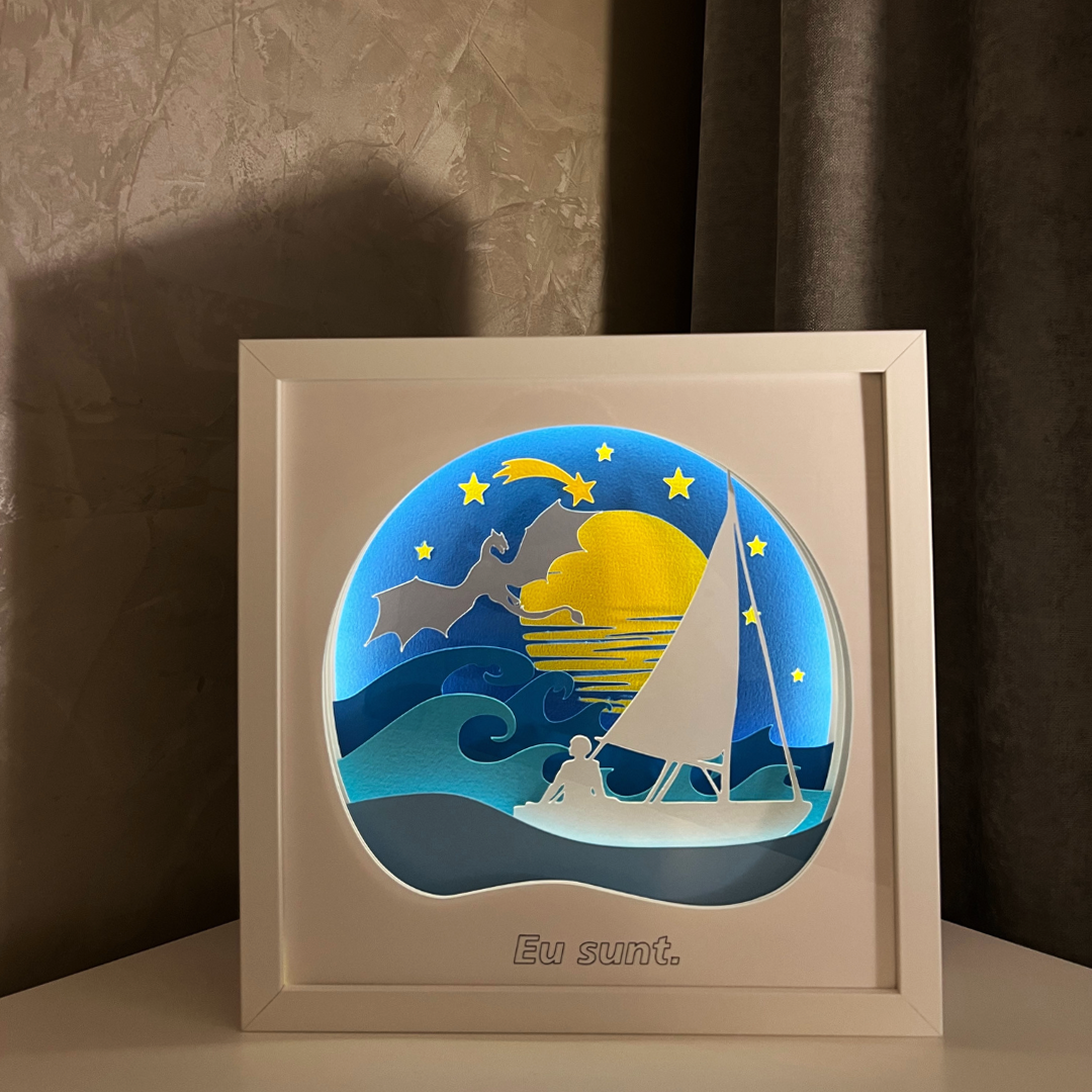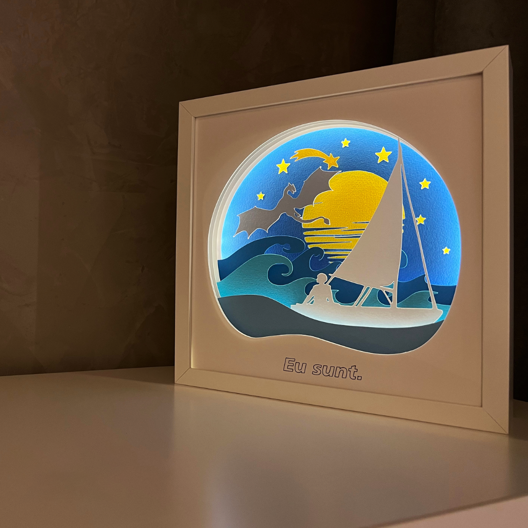 Tablourile luminoase lucrate manual, cu teme si mesaje personalizate, includ mai multe straturi de hartie, asamblate intr-o rama confectionata din MDF, cu protectie frontala din plastic polistirenic, fiind sigura pentru cei mici. Hartia utilizata pentru realizarea tablourilor este o hartie de calitate superioara, fara acid, care nu se ingalbeneste si are o rezistenta mare timp indelungat.