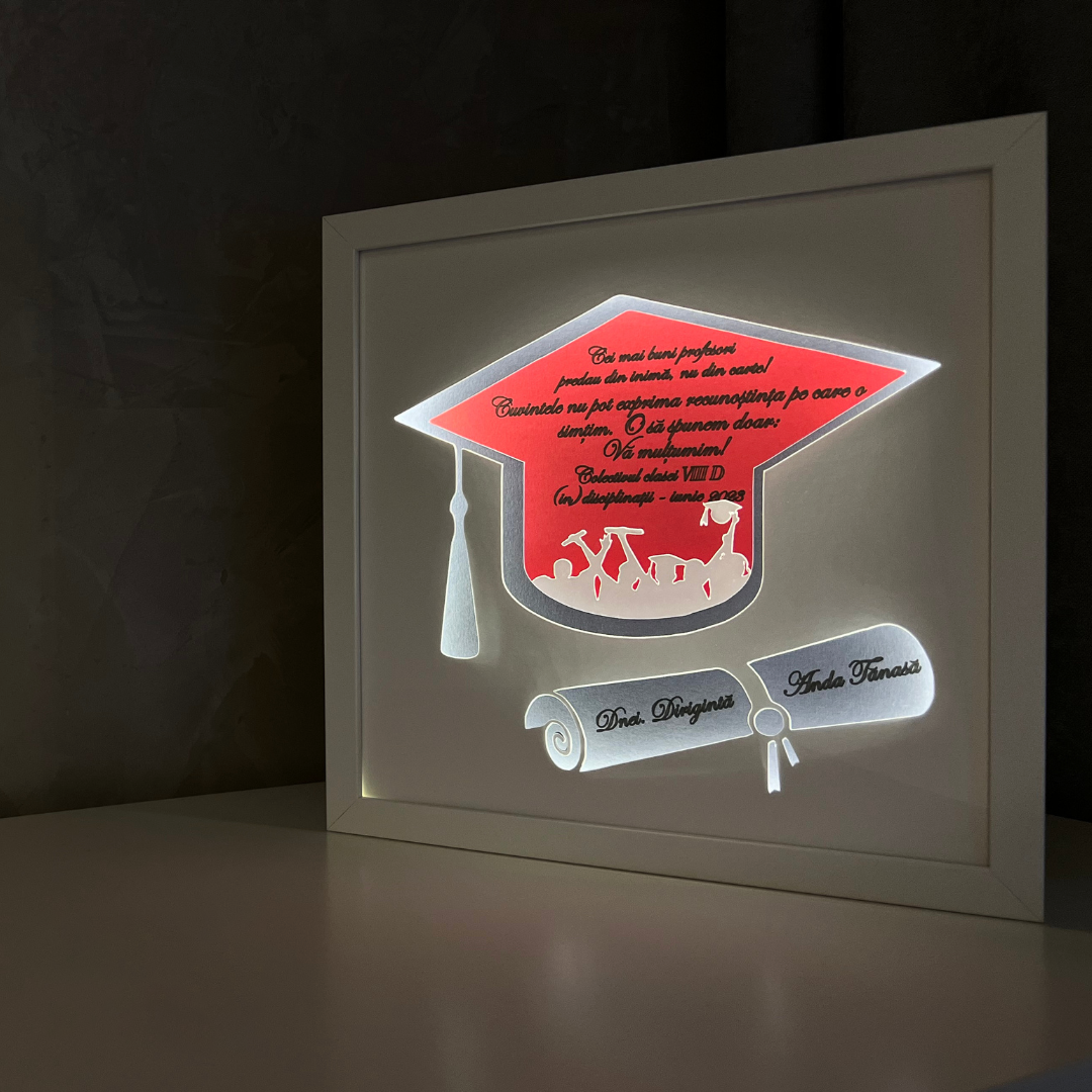 Tablourile luminoase lucrate manual, cu teme si mesaje personalizate, includ mai multe straturi de hartie, asamblate intr-o rama confectionata din MDF, cu protectie frontala din plastic polistirenic, fiind sigura pentru cei mici. Hartia utilizata pentru realizarea tablourilor este o hartie de calitate superioara, fara acid, care nu se ingalbeneste si are o rezistenta mare timp indelungat.